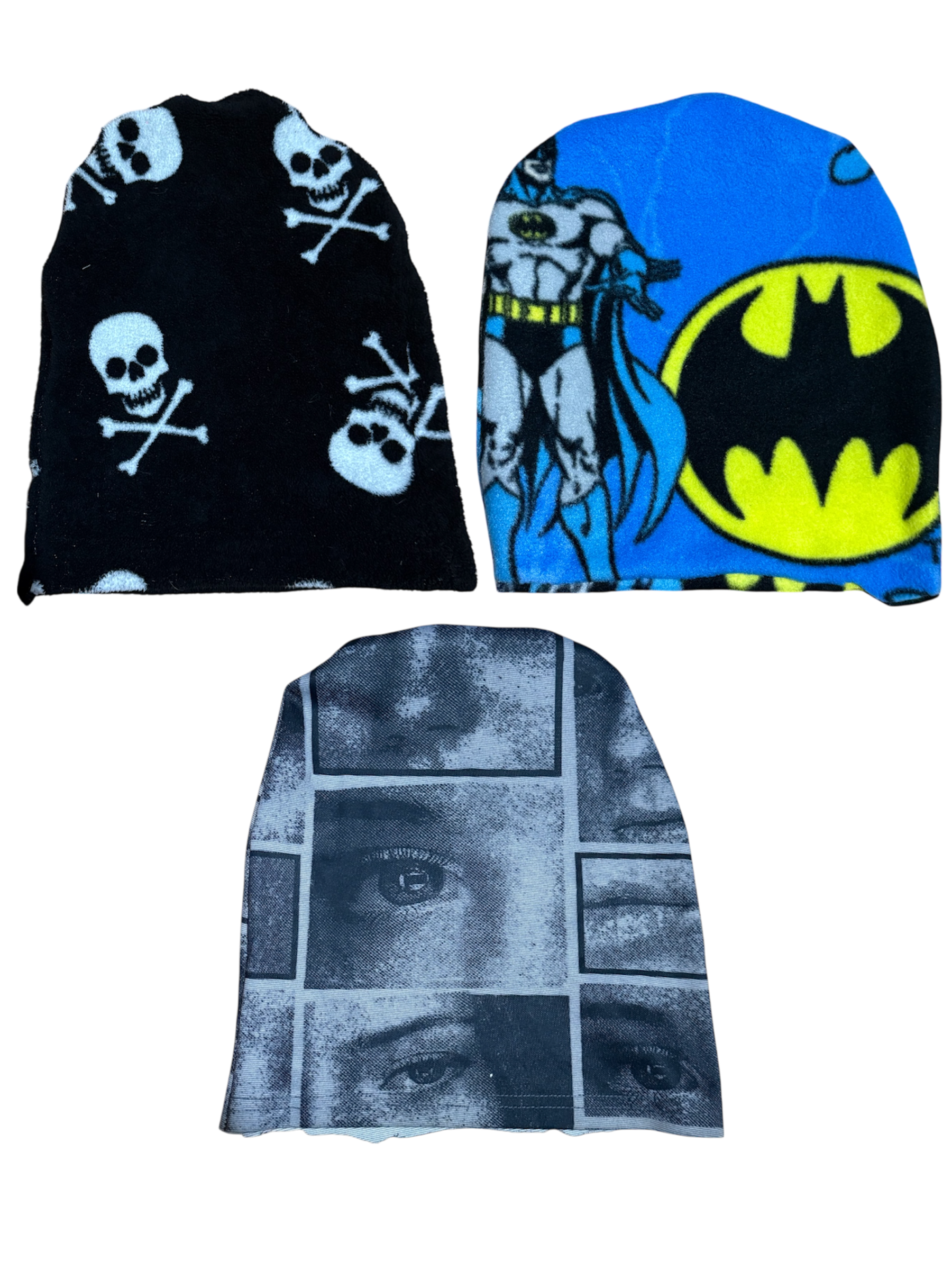 Batman and skull beanie are made from plush blanket material , the eye beanie is made from a cotton/spandex